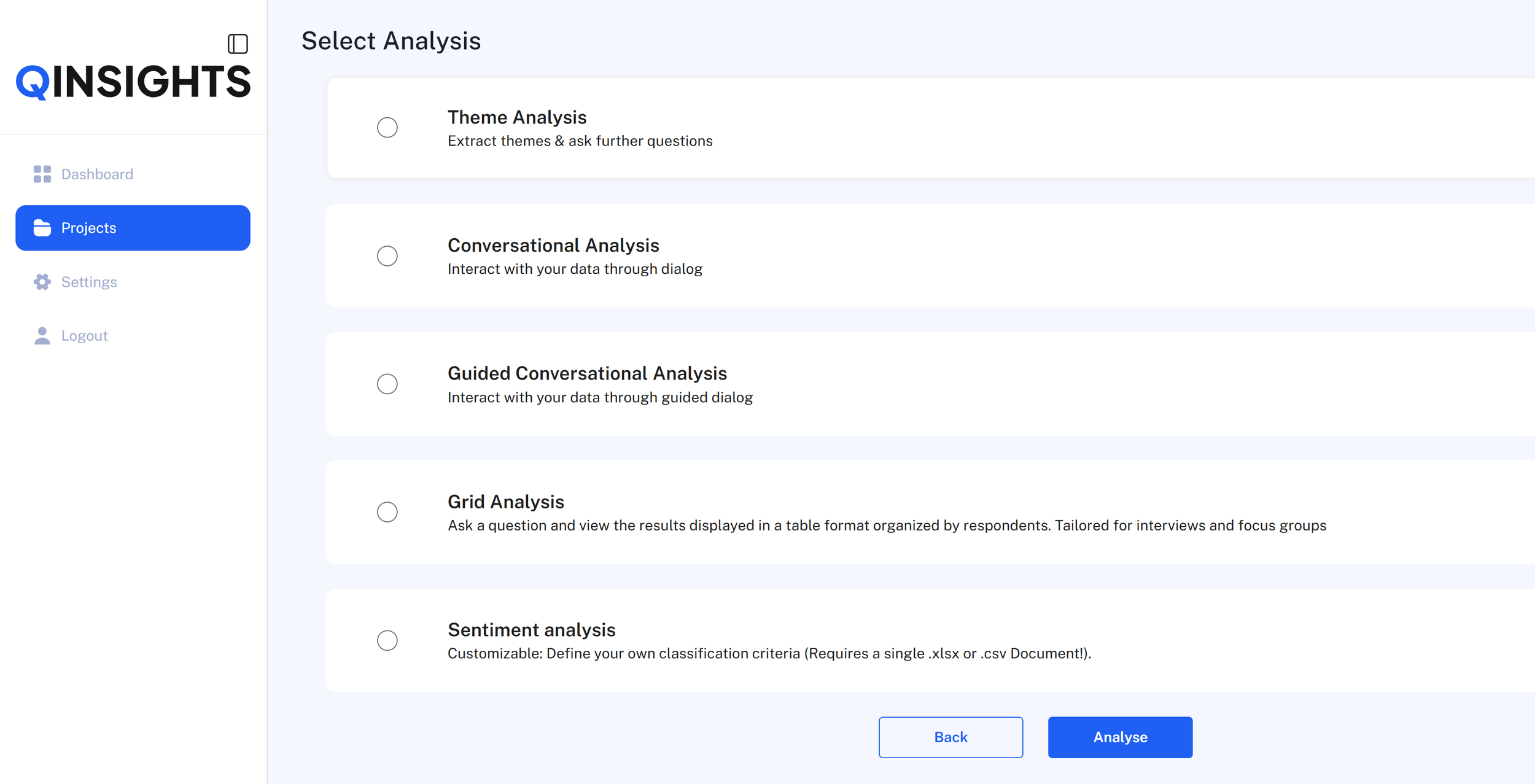 QInsights: Is a Qualitative Analysis platform. It doesn't just retrieve information; it is built to help you find patterns, derive themes, and explore the "why" behind human dialogue.