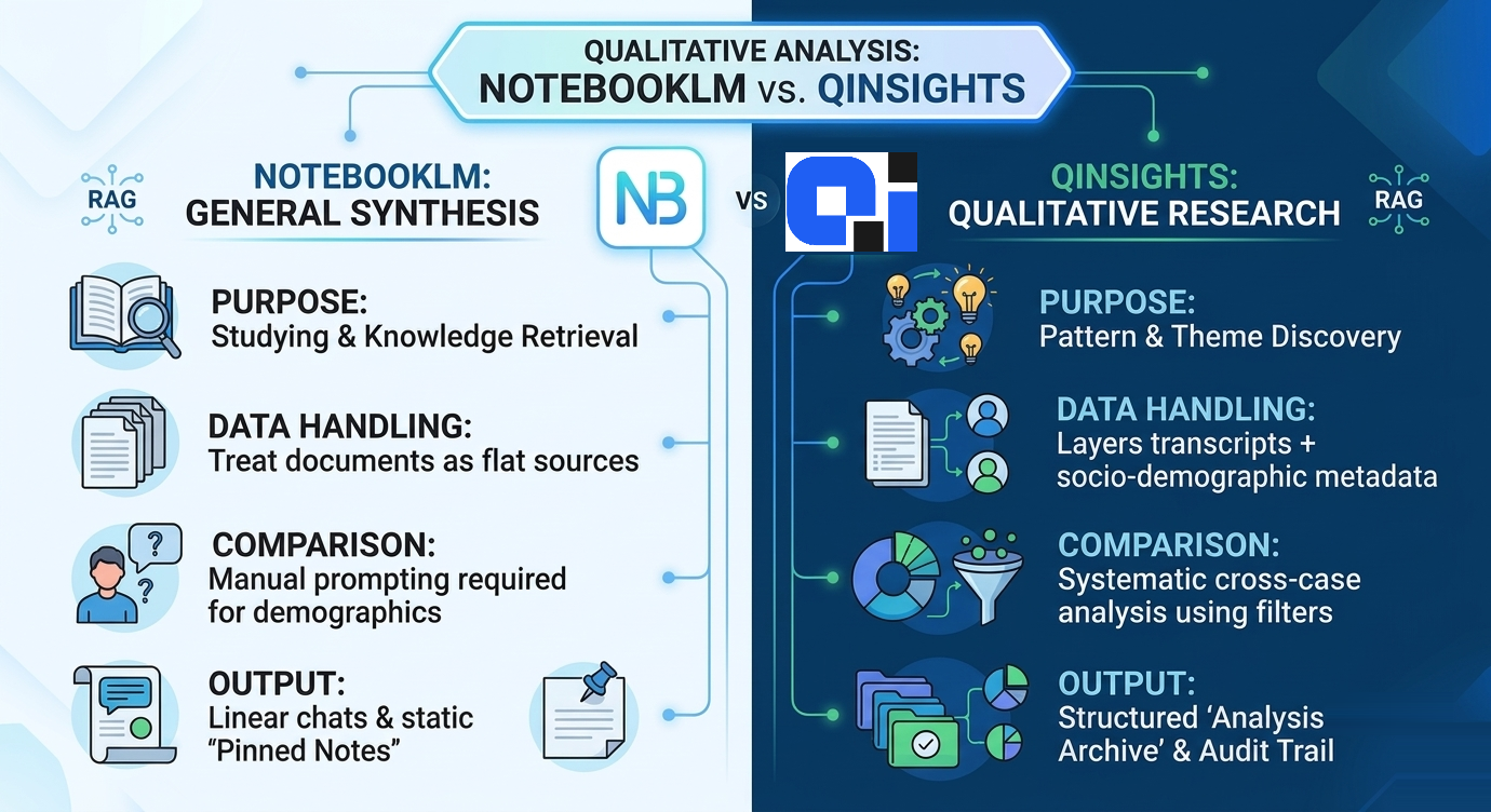 NotebookLM: Is "methodology agnostic." It treats a research transcript the same way it treats a physics textbook or a legal brief. It has no inherent understanding of qualitative research rigor.