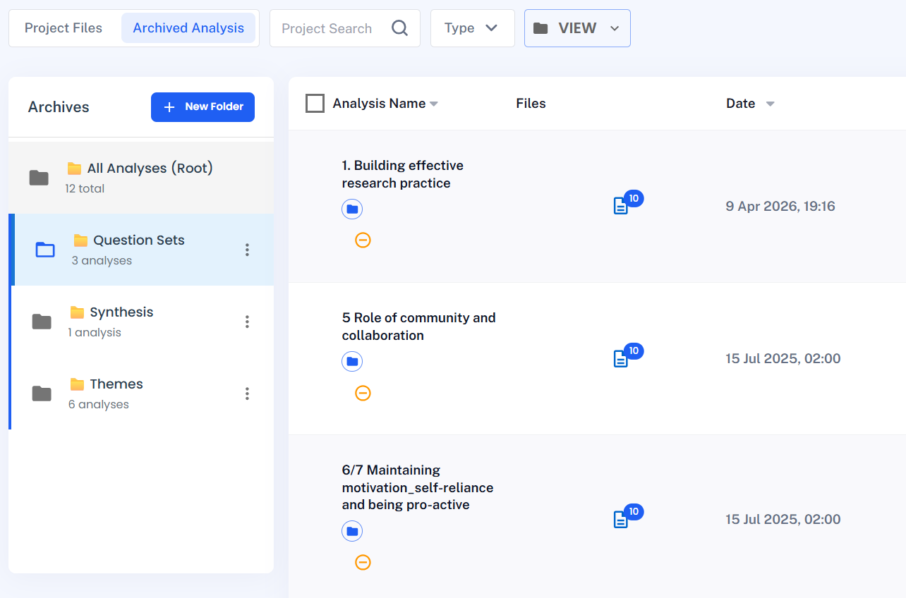 Organise themes, evidence, and interpretations in one place. Export what you need for your thesis, report, slide deck, or stakeholder presentation — with your analysis trail intact.