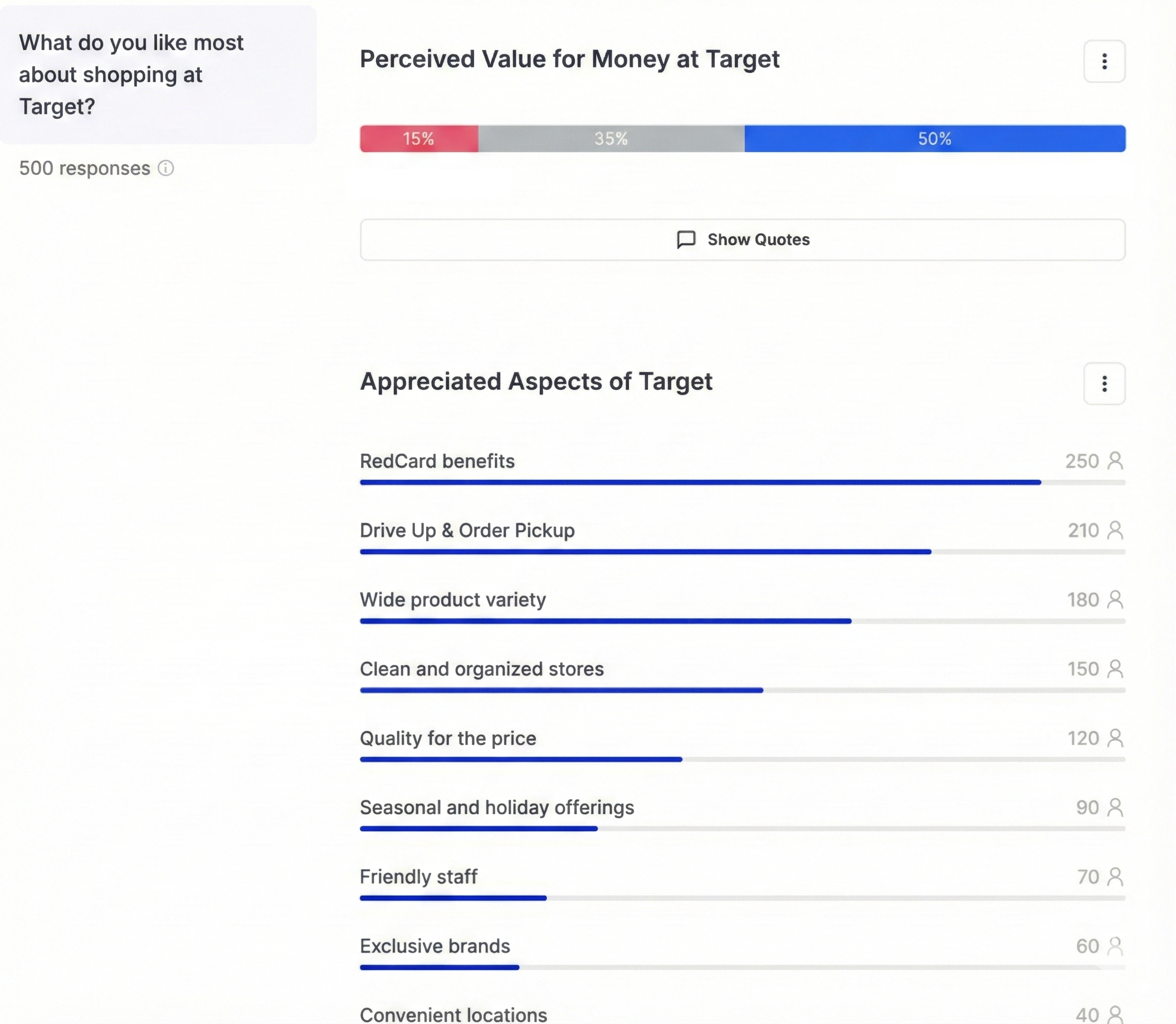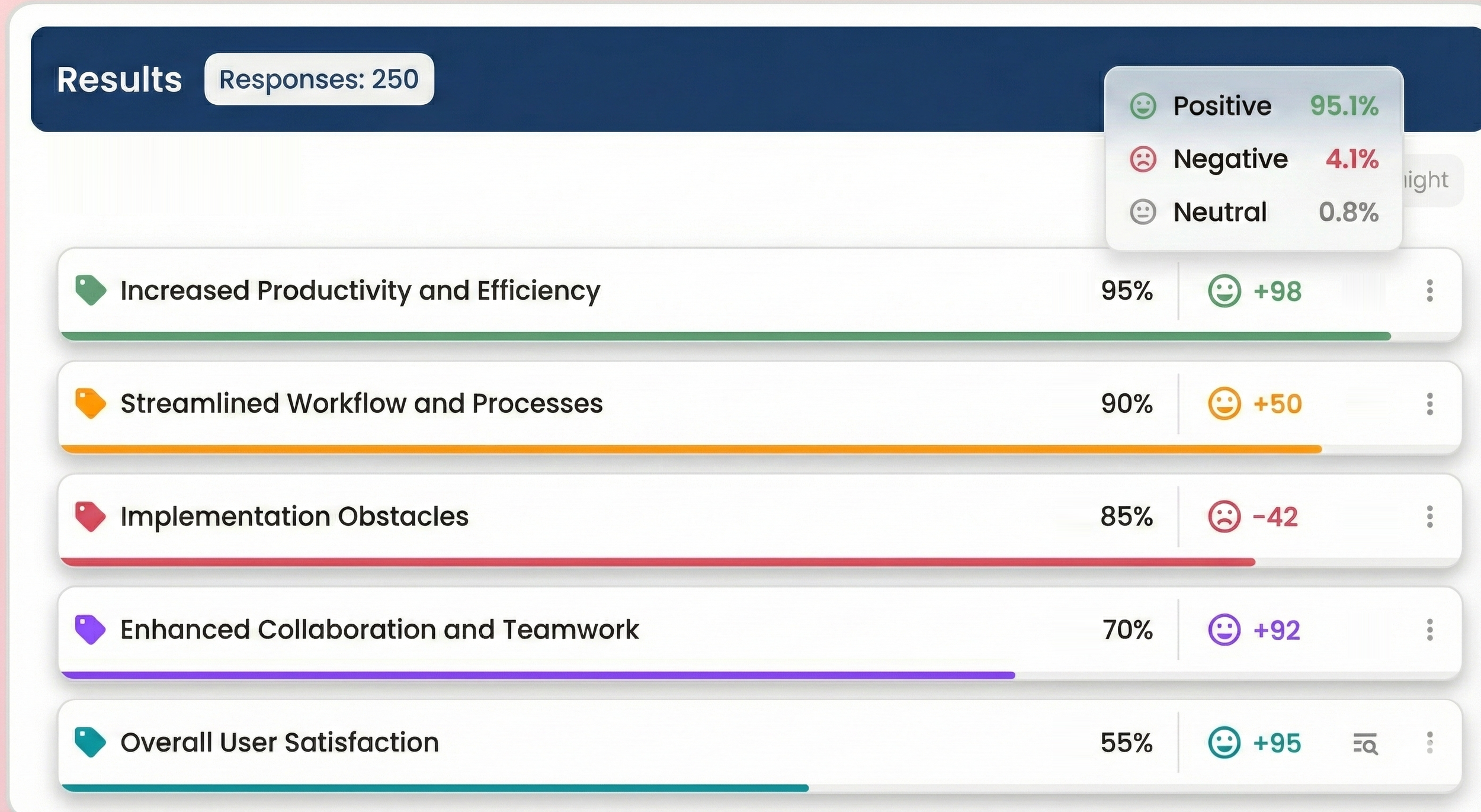 The tool assigns each response to one or more themes and gives you quantified results: "47% of respondents mentioned price," "23% expressed dissatisfaction with support."