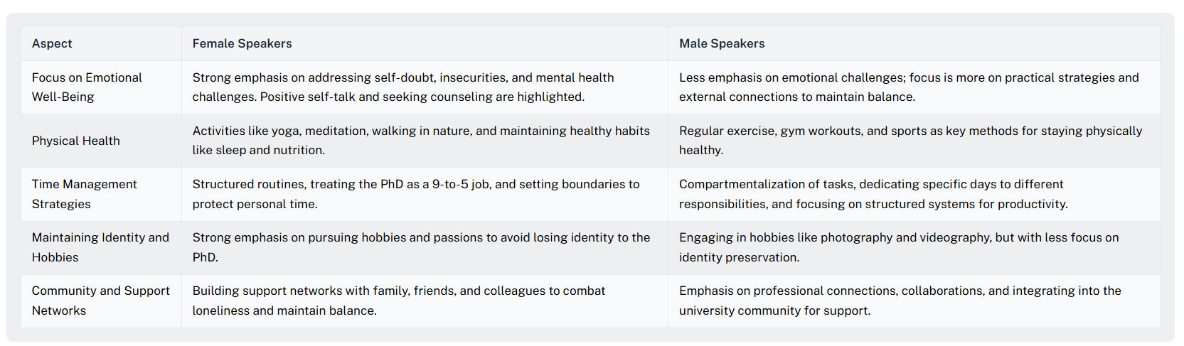 But sometimes you need to see the bigger picture at a glance. This is where QInsights' structured overview tables become invaluable. You can prompt the AI to create a matrix that shows how themes or perspectives appear across your respondents or subgroups—similar to the "matrix analysis" researchers used to do manually, but at scale.